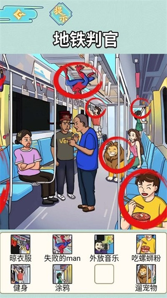 《地铁审判官》是一款休闲益智类的找茬闯关游戏。在游戏里,你能体验到别具一格的找茬闯关玩法,通过找出画面中不同之处来挑战各个关卡。游戏有着清晰明快的场景和舒适轻松的氛围,能有效缓解游玩时的紧张感。它的操作简单易懂,玩起来十分轻松,当你成功发现那些不合理的地方时,会收获无与伦比的成就感。