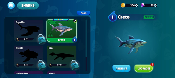 4、完成50个任务,寻找宝物取得金币与宝石,用来升级你的鲨鱼或者购买特殊救生道具!