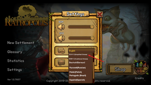 3、在弹出的下拉选项中选择简体中文就行。(点击后游戏会自动关闭,这不是闪退,重新打开游戏就能完成语言切换了。)