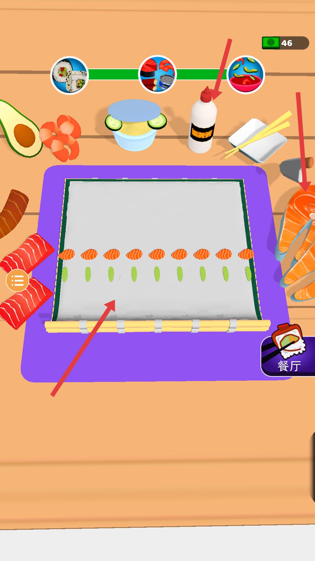 2、在制作界面搭配食材摆成寿司,契合顾客口味,观察用餐反馈,调整经营策略,让店铺更受青睐。