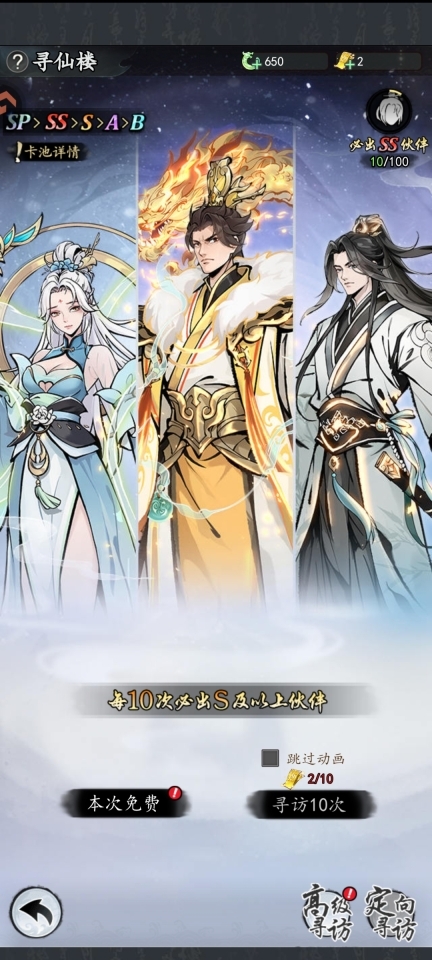 寻仙令优先抽核心SS伙伴,唤仙令专注升星主C伙伴(如叶天帝)。