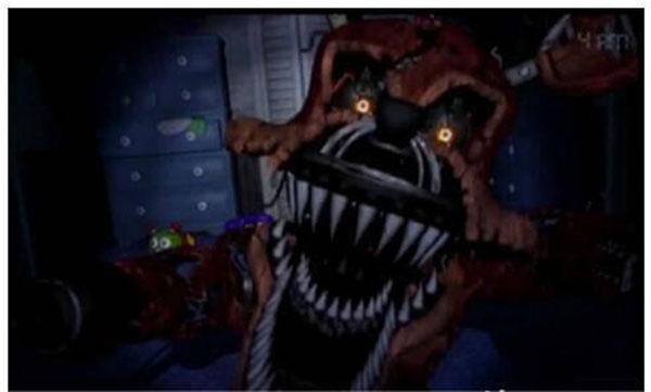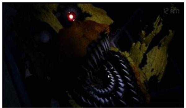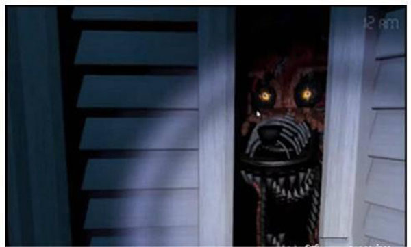 2、后半夜玩家会比较忙碌,除了之前要做的事,中间位置的狐狸会出现。它第一次来的时候,和第三夜一样有声音与柜子门的提示,但之后会持续尝试打开柜门出来。并且这些提示不太明显,需要玩家把检查狐狸的动作加入到巡查循环中,这会让玩家更手忙脚乱。只要记住按照左、右、中间、再后面的顺序循环操作直到六点,就能通关。(具体操作说明其实比较简单,但放到实际游戏场景里还是会变难,只要细心点、速度快些就能通过)