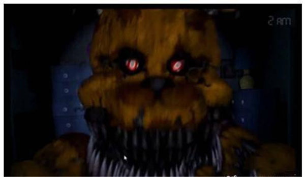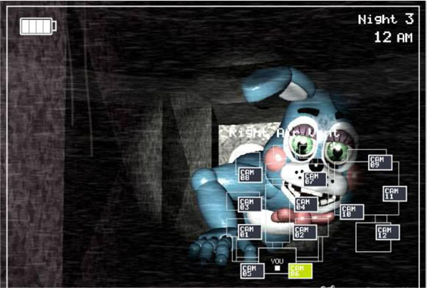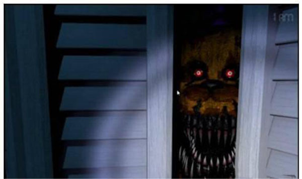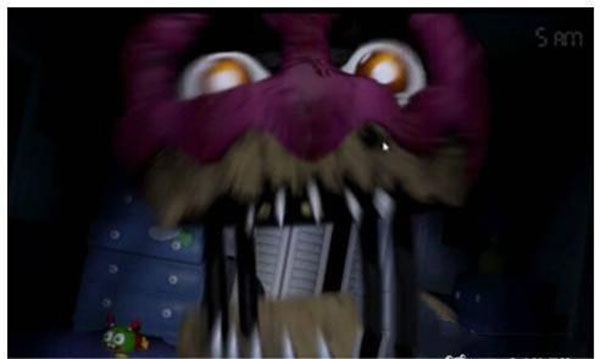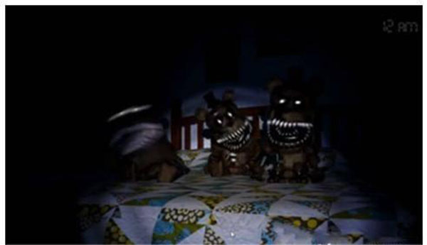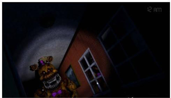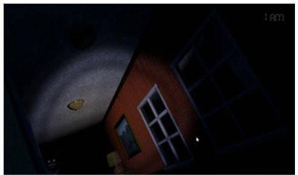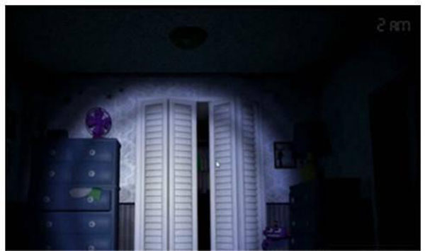 3、大概2点左右会传来熊的笑声,这时候得赶紧查看前方和后方。要是熊在柜子那里,就把柜子门关上;要是在后面,就开灯把它驱散。之后就重复这样的循环:根据脚步声判断熊来的方向,听到笑声就检查前后。(这一关和之前不一样的点在于,玩家就算长时间不开灯照射走廊,也不会有其他熊来攻击玩家,所以听到声音时直接关门就行,不用开灯,这样能节省一点时间)