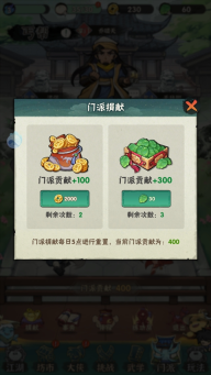 3、捐献与门派贡献。门派贡献量展示在正下方,我们能够通过捐献提升门派贡献,也可以借助门派玉牌这类消耗品来增加。