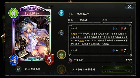 再说到最高稀有度的虹卡,也不能简单把它的上限视为2.0。就拿超越者的机械降神来说,作为一张虹卡,它登场就能给主战者附加当局战斗中永久生效的效果——回合结束时根据共鸣状态重新抽6张牌。对任何职业而言,一次性抽这么多牌都是相当恐怖的效果,很难衡量这张卡带来的价值究竟有多大。在我看来,这张卡对造物超越卡组的超越者来说,效果系数甚至能超过3.0,也就是说一张6费卡的作用相当于18费以上(参考抽卡类法术的模板,通常是3费抽2.5张)。