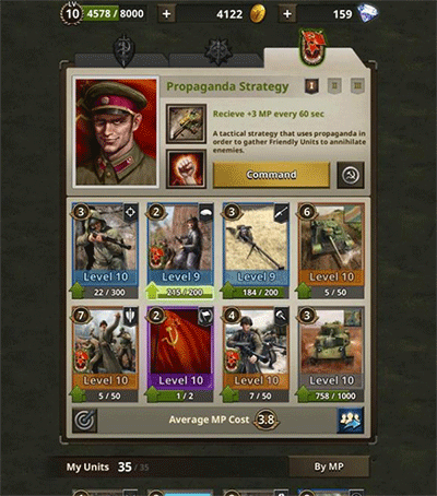 要么用纯人海战术,要么就走低费装甲海路线,动员兵作为一费单位,核心作用是换牌,小型精炼所的功能也类似。进攻时主要依赖五费枪榴弹来拆基地,补给车则负责给多人队伍补员,“为了祖国”技能能暂时消除士气低落的负面状态。要是对面用人海,就派双人班狙击手应对,因为是双人班配置,卡车也能给它补人。我常用的是人海流的先发制人战术——搭配乌拉和IS2,科技树全点第一列,卡组里包含游击队、近卫军、近卫军7人队、喷火兵、反坦克枪、双人狙击手(女狙也行)、2费的反坦克地雷车,还有旗子兵。这套卡组的核心是近卫军和喷火兵配合拆塔,旗子兵要跟着人潮推进,同时得注意保护IS2。我的指挥官选的是先发制人,卡组具体是:反坦克兵、冲击近卫部队、近卫军、侦查狙击手、游击队(有铁拳加成可以带,没有的话就换T34)、突袭工程兵、惩戒营、坦克歼击车。我现在8级,已经打到2700杯了,这套卡组很稳定。技能带的是斯大林之拳和祖国母亲,技能强化自然全点步兵方向。这套打法最关键的就是和斯大林之拳技能做好配合。