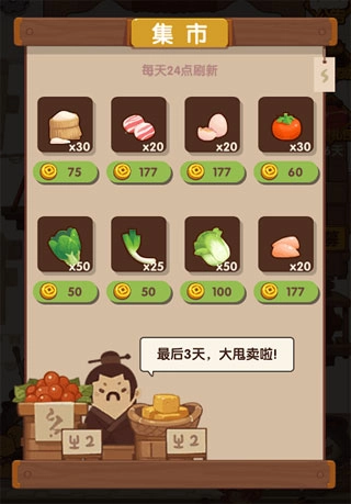 初始集市不会立即解锁,需要跟随主线任务的推进逐步开启。随着客栈客人日益增多、生意愈发红火,部分食材需前往集市采购——此时可使用客栈经营赚取的金币,在集市购买所需食材以满足客人需求,同时还能获得更丰厚的奖励哦!