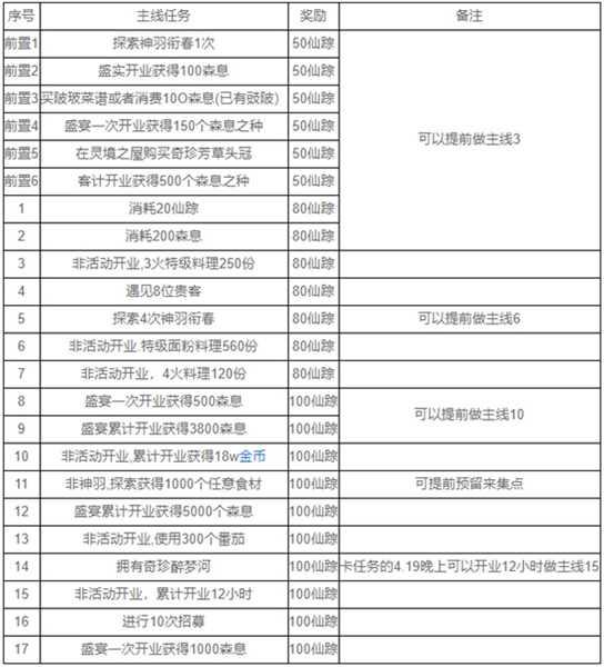 2、重点:盛宴每次开业40柴火,每次有100森息保底(1份青菜也可以,但建议拉满9组贵菜),前期建议拉满9组总价最贵的普通菜谱,等活动食材多起来就用活动菜谱+普通菜谱搭配使用,