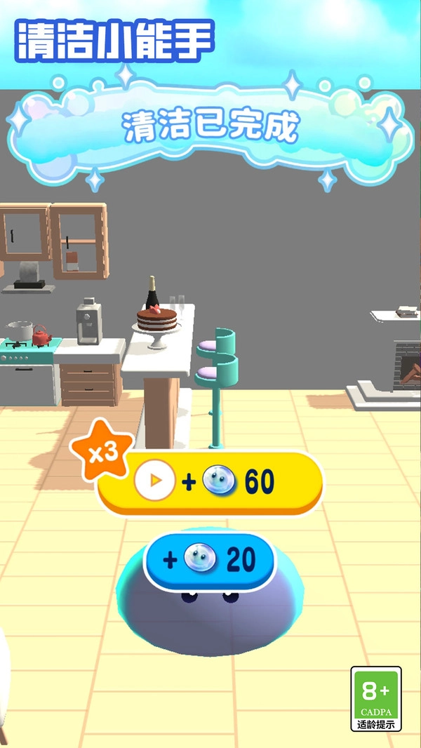 2、任务挑战:完成指定清洁目标,获取金币奖励解锁新区域。