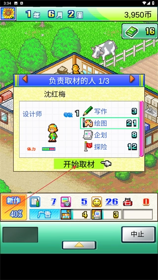 4、当新作进度达到百分之四十时,可以进行杂志取材,选择合适的人选后点击开始取材按钮即可。