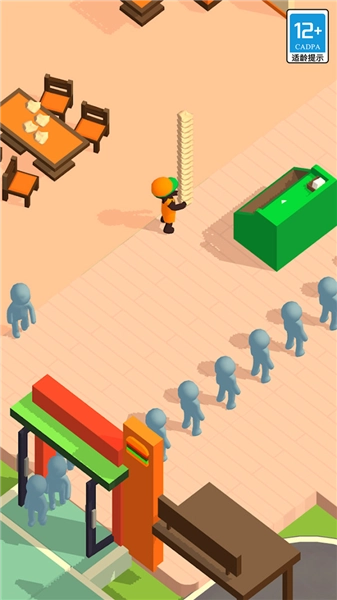 3、扔掉垃圾领取收益,不断解锁更多的区域,放置更多桌子。