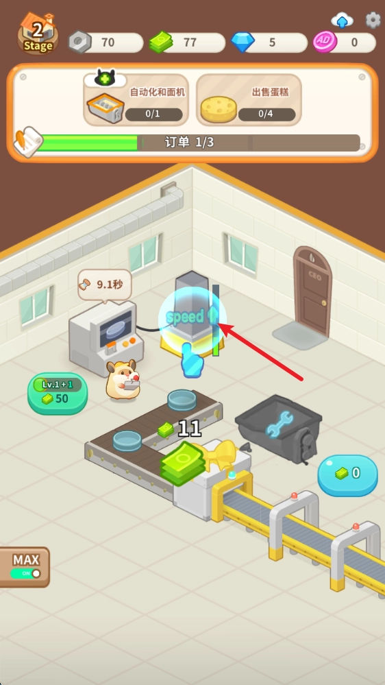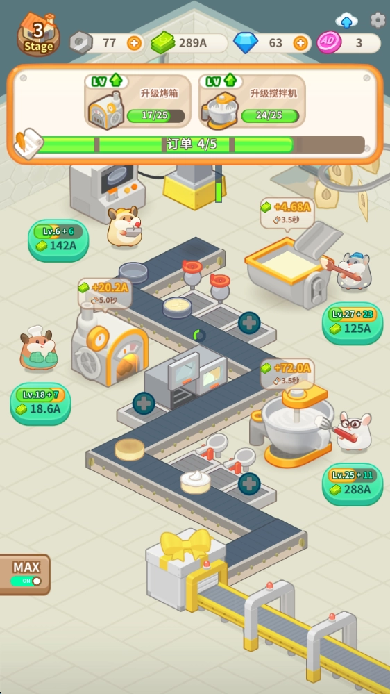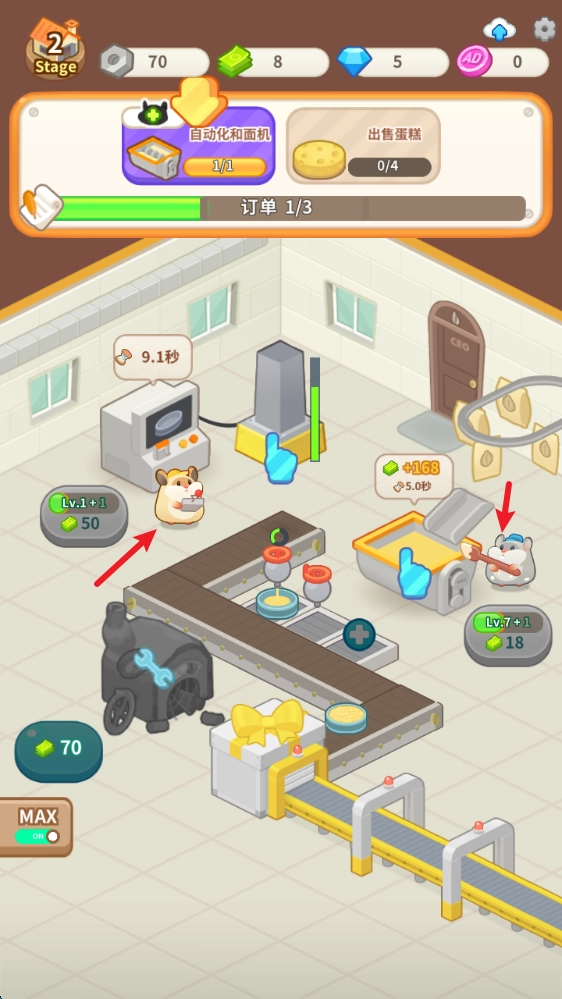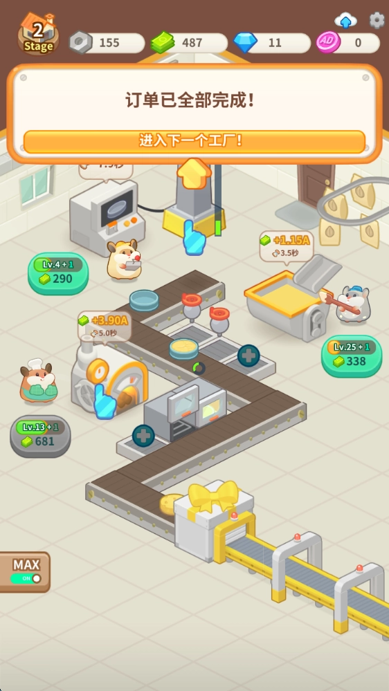 1、打造并升级各类机器,为其配备合适的仓鼠经理负责管理,以此达成蛋糕制作的全自动化流程,进而完成更多订单任务。