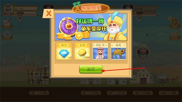 4、打开每日抽奖界面,点击抽奖按钮,获取钻石、金币等资源,积累资本。
