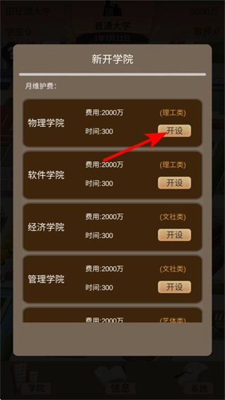 2、在游戏内的新开学院界面,挑选物理学院这类目标学院并点击开设按钮,通过消耗资源来完成学院的创建。