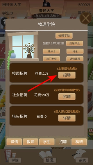 4、在学院招聘界面,点击校园招聘对应的招聘按钮,消耗1万资源招募教职工,完善人员配置。