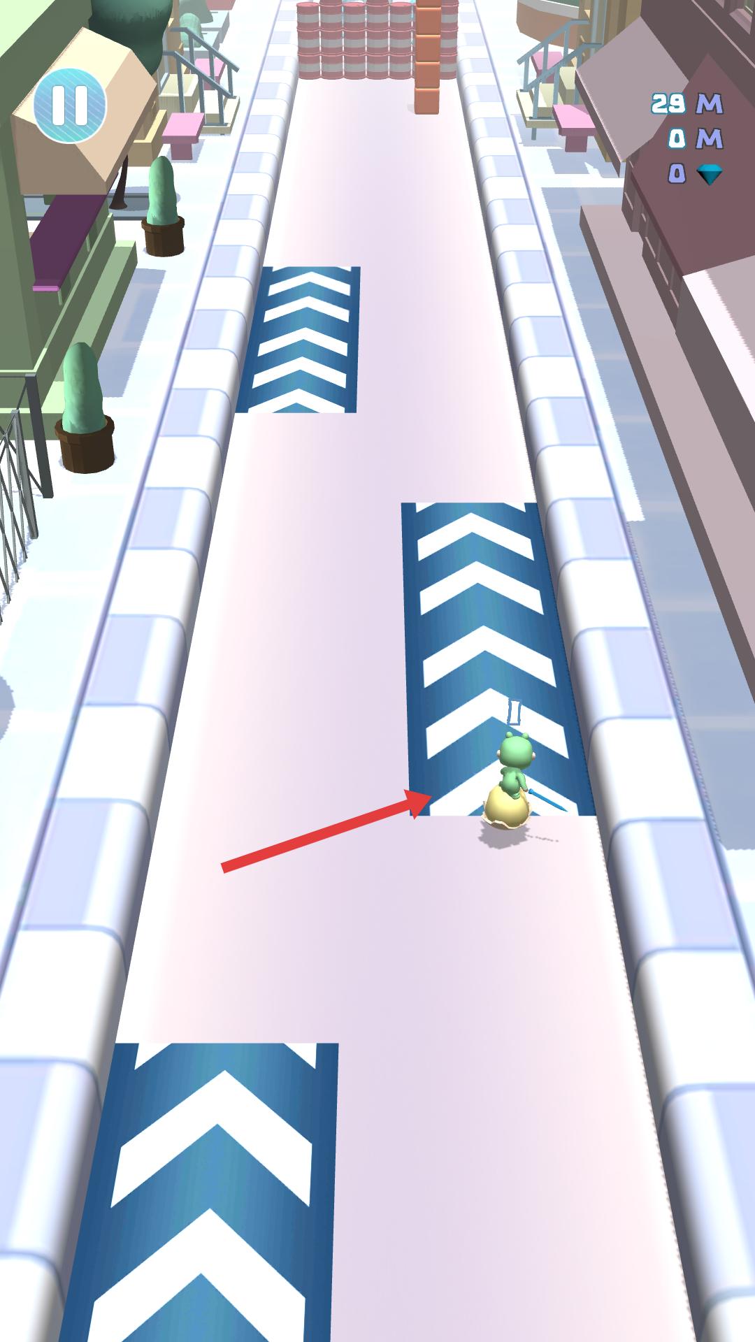 2、操控角色跑酷,遇到加速带,引导角色通过,借助加速带提升速度,获取更多钻石。