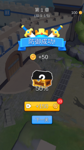 3、当你成功抵御敌人的进攻后,屏幕会弹出【防御成功】的提示,此时你将获得金币奖励,点击【下一关】即可继续挑战。