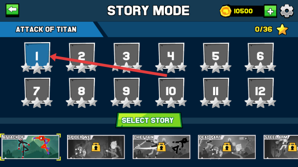 2、在故事模式关卡列表中,通过点击选择标有1的关卡,进入战斗场景,操控火柴人角色开启与敌人的对战。