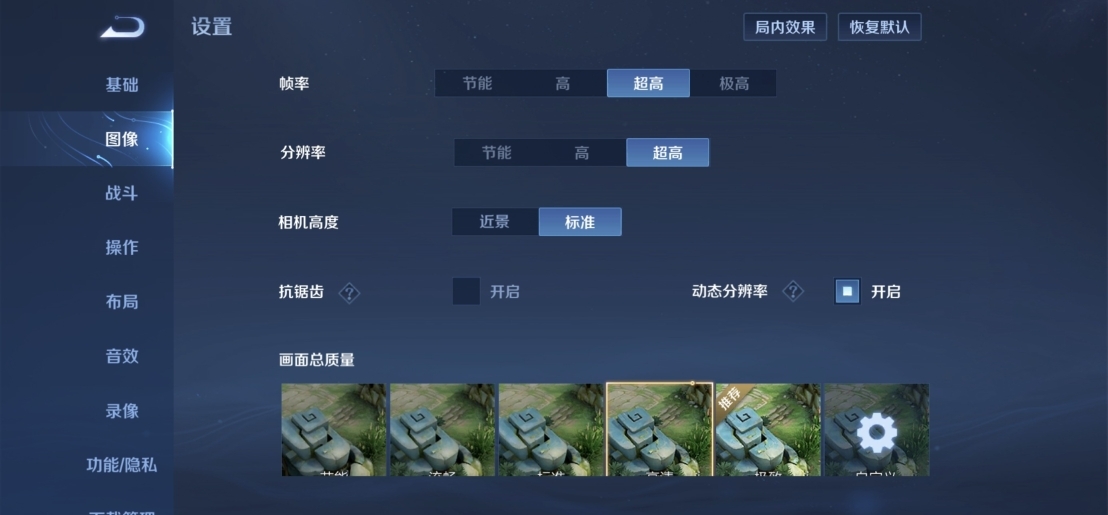 1、进入王者荣耀主页点击右上角齿轮图标 > 图像,适当降低分辨率和帧率,并开启动态分辨率;