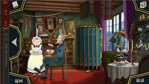 1、与格雷格森对话,得到证物:现场地图。移动到福尔摩斯的房间,与爱丽丝对话。
