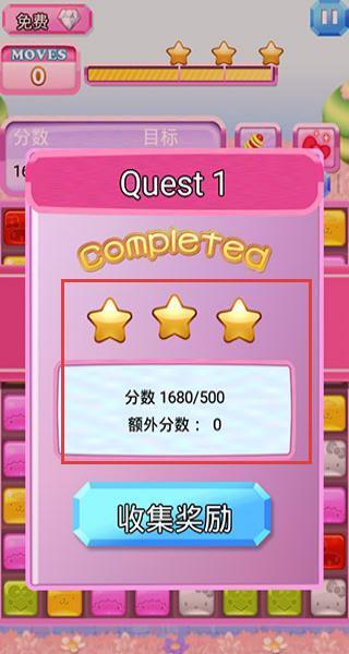 2、道具组合策略:多种消除道具可组合使用,如“彩虹糖”搭配“炸弹”实现全屏清场,考验玩家对道具效果的理解与关卡局势的判断。