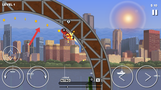 2、行驶至拱桥时,把握时机收集空中金币,借助操作维持车辆平衡,顺利通过拱桥地形。