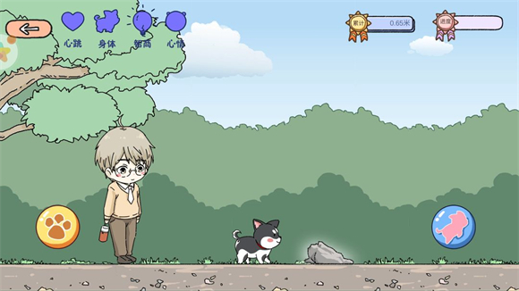 在地图中探索时,你会邂逅宠物医院、城堡、水果屋等特色地点。点击进入任一地点后,会随机生成一组卡牌,每张卡牌都能对角色的心跳、身体、智商、心情这四项属性值造成不同程度的影响。一旦其中某项属性值跌至最低限度,本次遛狗之旅便会宣告结束。
