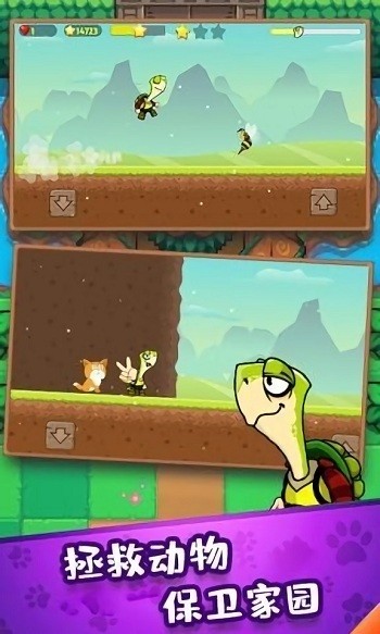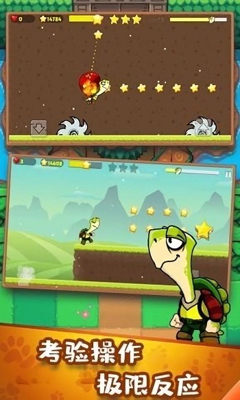 1、丛林冒险闯关:操控小乌龟穿梭于丛林之中开启冒险之旅,灵活避开道路上的各类障碍,战胜阻拦前行的敌人,朝着难度更高的关卡发起冲击与挑战。