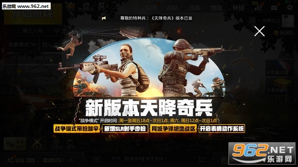 1. 新增娱乐模式“战争模式”,限时开放,玩家等级达到10级即可参与;该模式开局会随机分配一种武器,被淘汰后能重新跳伞继续战斗,最终以队伍积分高低判定胜负。