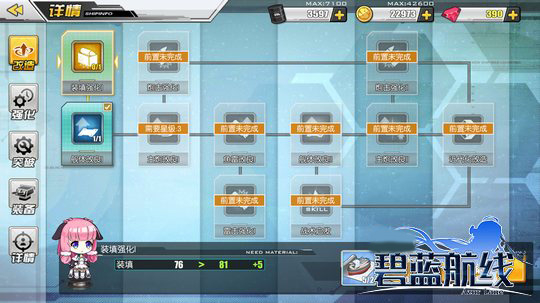 3、在船坞中打开可改造舰娘的属性页面,即可进入改造系统,这里能看到多种可强化改造的属性。改造会有等级、星级方面的要求,并且需要消耗【改造图纸】与物资。