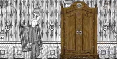 进入地下室,穿过很多洋娃娃的房间,一幅特殊的红色边框女性画, 向前,终于遇到大麻烦,一个巨大的怪物出现,躲进衣柜。