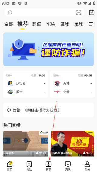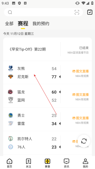 1、在软件界面,点击【赛事】,进入赛事界面,查看各类赛事赛程信息。