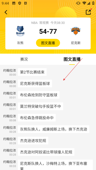 4、进入图文直播界面后,就能【查看赛事的实时直播信息】,从而完成赛事直播的查看操作。