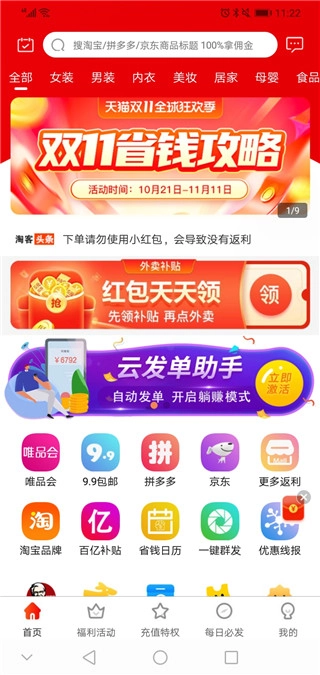 优返联盟(曾用名淘客联盟)是一款便捷实用的网络购物返利APP,聚焦于天猫和淘宝。用户仅需轻松进行复制粘贴操作,完成下单后就能获取高额返现优惠,购物最高返利可达80%。它是淘宝天猫购物达人们爱不释手的省钱利器,返利比例比95%的同类软件都要高。该平台不仅为用户准备了诸多省钱福利,各类大牌优质商品也应有尽有。在此,你能随心选购所需商品,商品品类丰富多样。此外,还有大量优惠券等你来免费领取使用,参与各类福利活动,就能以实惠价格购得心仪商品!