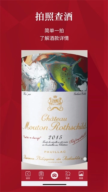 特色拍照查酒功能,无需费力辨别酒标上的外文字母,只要简单拍拍酒标,或将相册中的酒标图片上传,立即可获取酒款的酒庄、产区、品种、风味、名家评分和参考信息等信息。