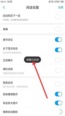 4、进入阅读设置界面后,我们只需将弹幕后方的滑块滑动至灰色状态就可以了。