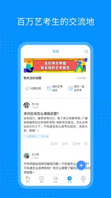 有问题随时提问,各式的艺考学习资料:文艺常识、写作技巧、自备稿件、声台形表、摄影技巧、小三门、乐理题等帮你扫清艺考的障碍!