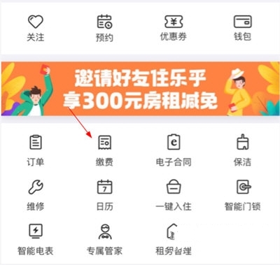 2.进入个人中心界面后,点击图中所示位置的【缴费】功能按钮,就能续交房租了。