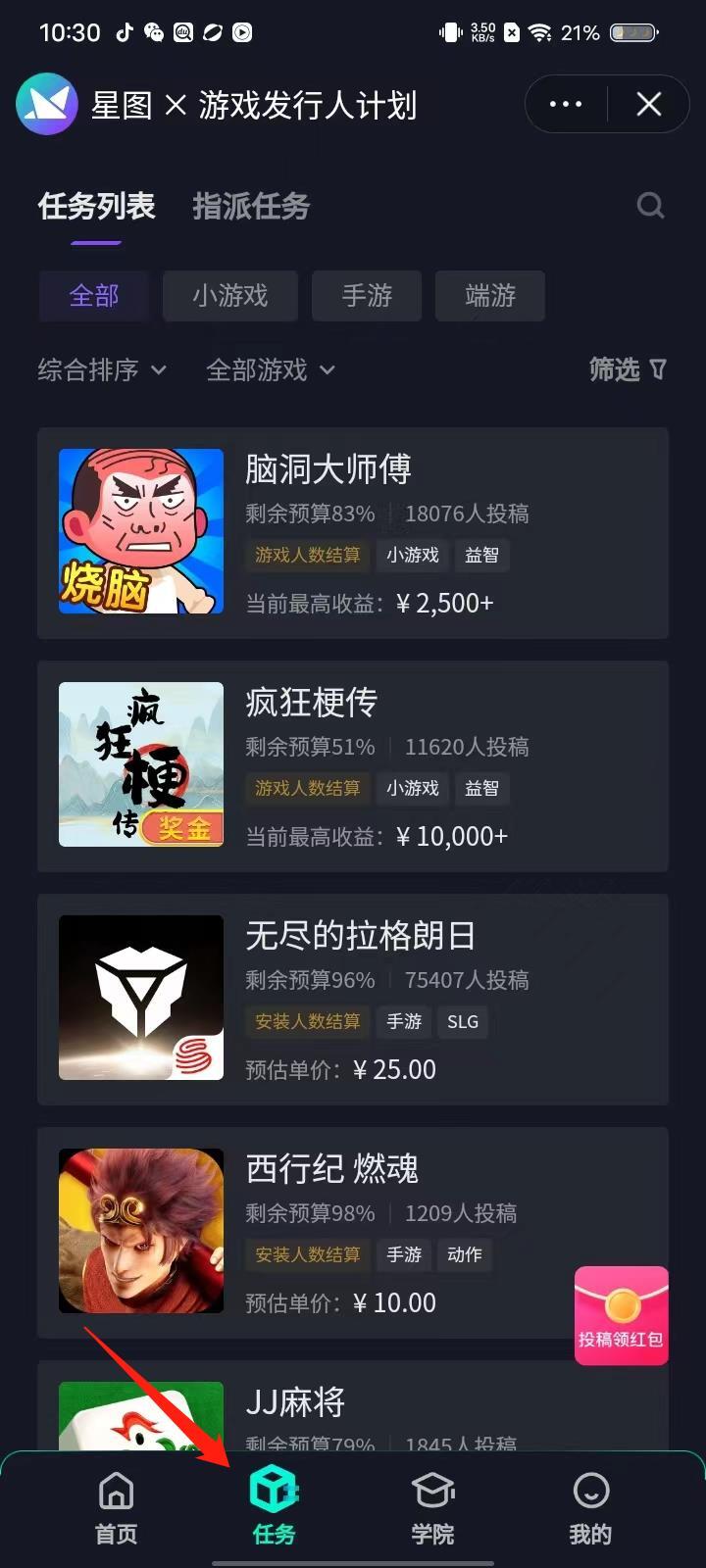 4、在任务列表下,选择“小游戏”,再选择你喜欢的游戏;