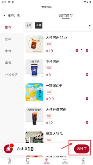 1、打开横店电影城的,点击底部食品饮料的选项。