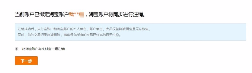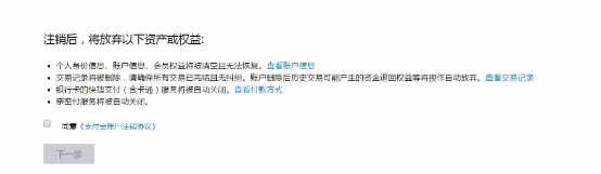 4 如符合注销条件,会进入确认放弃权益页面(包括个人信息、交易记录,快捷支付),点击【下一步】(如果有绑定淘宝且满足注销/解绑条件,会告知淘宝账户与支付宝一起注销/解绑,具体以页面提示为准)
