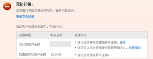 3 信息提交后,系统会自动检测账户是否符合注销条件, 不符合注销条件,页面反馈报错提示(以账户有余额报错为例)