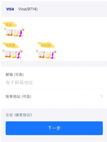 4.姓名,有效期,CVC是必填项哦(下面的邮箱和地址选填不影响添加银行卡)