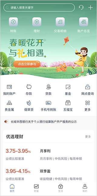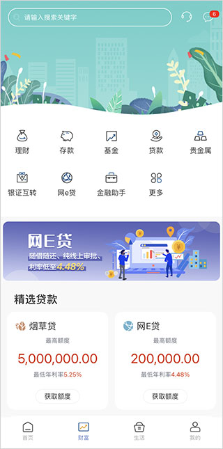 打开软件后,首页就有账户查询、转账汇款、贷款这些常用功能,能让大家找起来更方便。