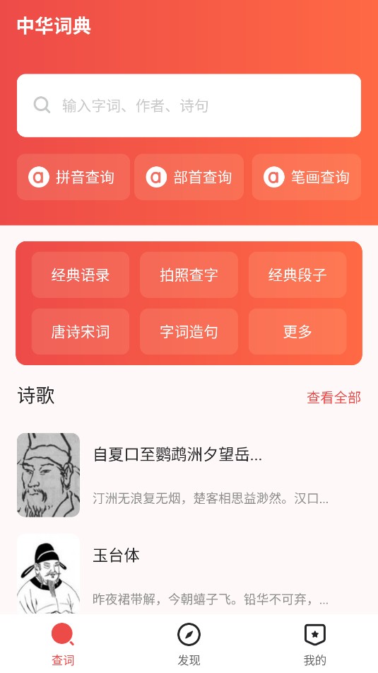 1、打开,可在搜索框输入字词、作者、诗句来搜索相关信息。