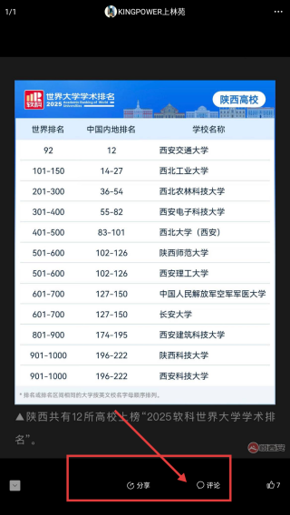 2、在西安圈子动态中,找到KINGPOWER上林苑分享的世界大学学术排名内容,查看院校排名。