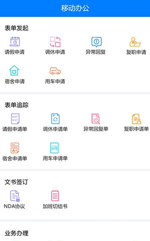 3、拥有多个服务模块,还有很多的申请入口,请假、离职、入职等都是可以在这里直接进行办理的;