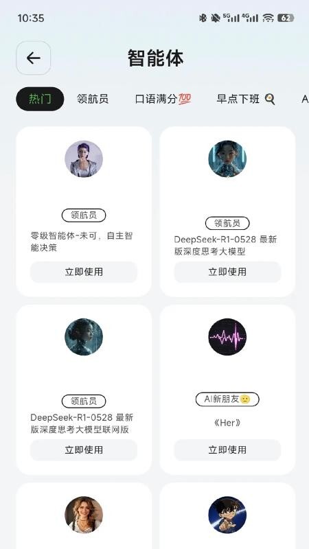 在智能体广场中心,你能够查找并使用自己喜欢类型的智能体形象,还能获取AI智能好友以便随时进行聊天互动。