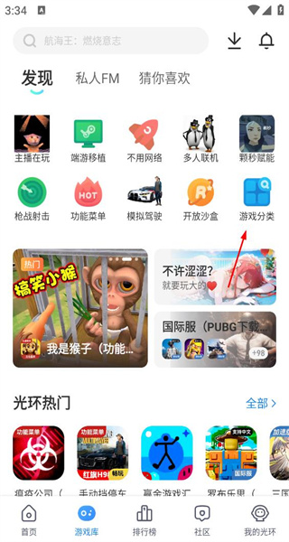1、打开光环助手,进入发现页面,点击游戏分类相关入口,进入分类对应的操作页面。
