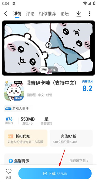 4、选择吉伊卡哇游戏进入详情页面,查看该游戏的详细信息,在确认符合需求后,点击页面底部的按钮即可开始。